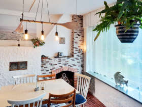 Im Erdgeschoss, das zum See hin ausgerichtet ist, befindet sich eine geräumige, voll ausgestattete Küche, ein gemütlicher Salon mit bequemer Couch, Esstisch, Fernseher und Kachelofen, ein Gäste-WC und ein weiteres Schlafzimmer mit Doppelbett.